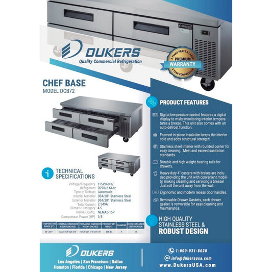 Dukers DCB72-D4 72" Chef Base Refrigerator with 4 Drawers
