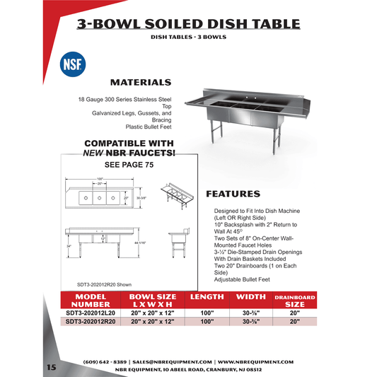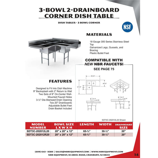 NBR 3-Bowl 2-Drainboard Corner Dishtable