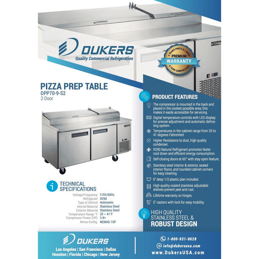 Dukers DPP70-9-S2 Commercial 2-Door Pizza Prep Table Refrigerator