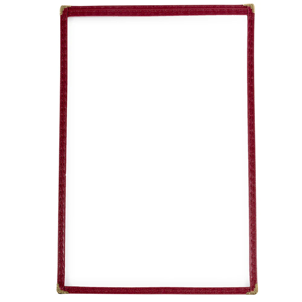 Menu Cover, single, overall 9-3/8" x 14-7/8", holds 8-1/2" x 14" paper, double stitched edging, plastic, burgundy