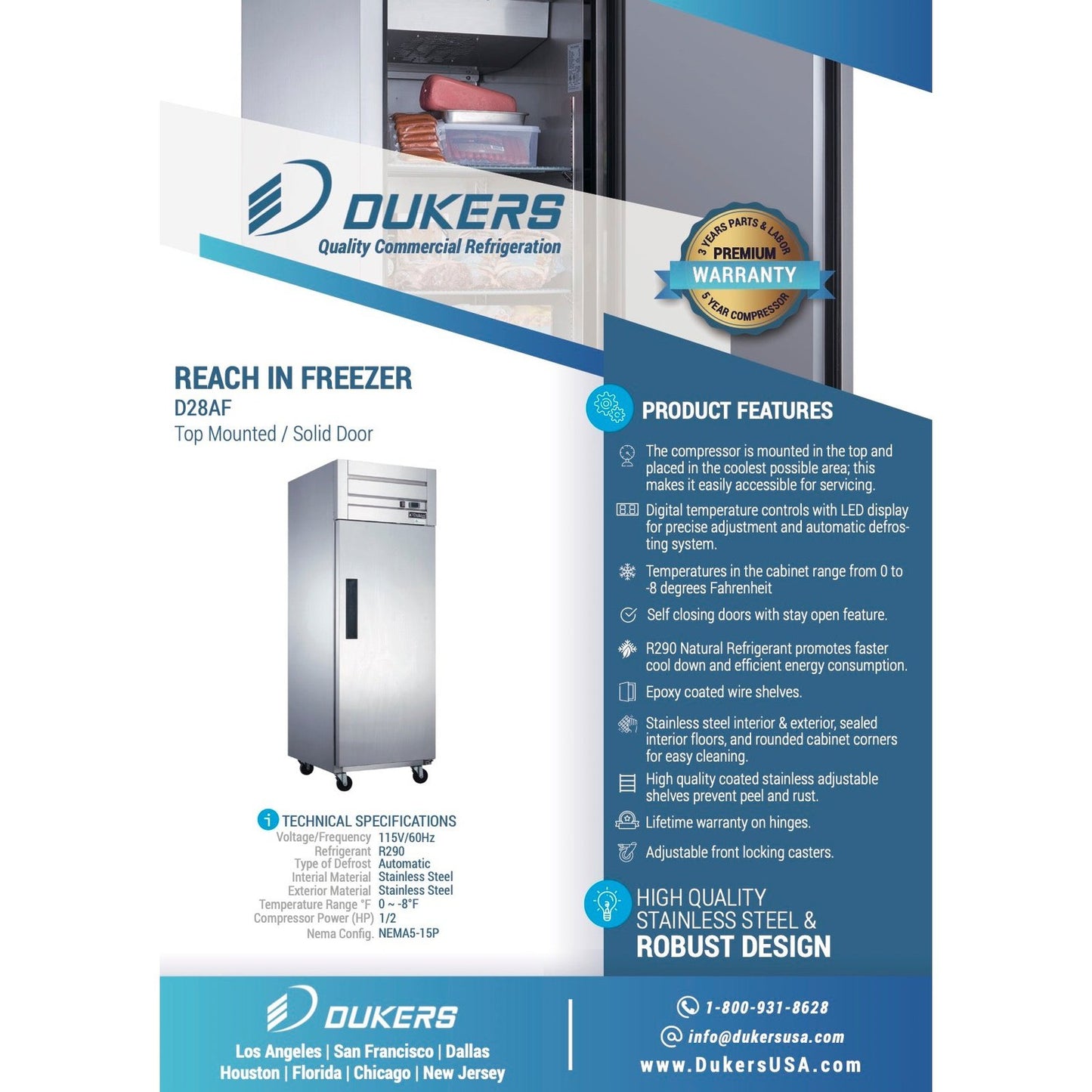 Dukers D28AF Commercial Single Door Top Mount Freezer in Stainless Steel