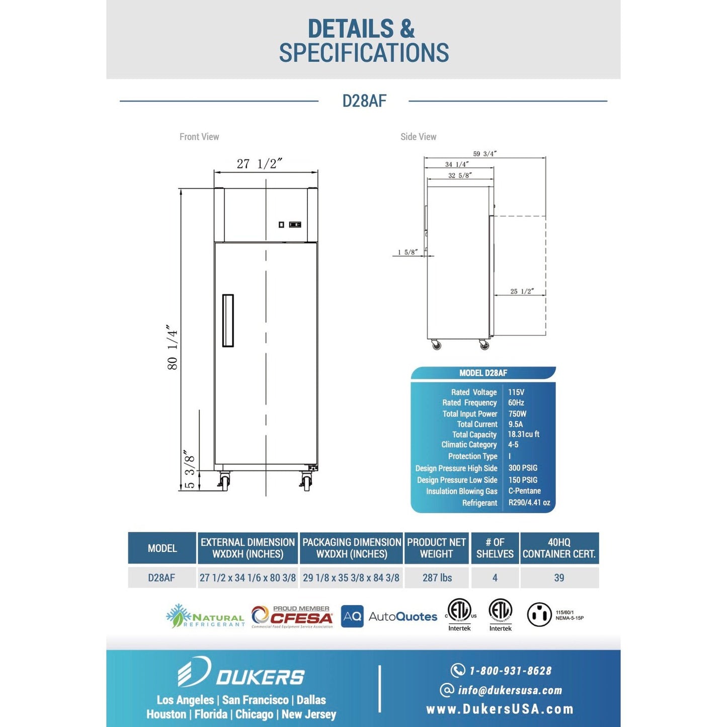 The Dukers D28AF reach-in commercial freezer is designed to suit the needs of any business who needs optimal performance without sacrificing design. A single door is accented with high-quality brushed stainless steel for both the interior and exterior to fit a variety of decors. Recessed door handles allow for clean styling and better ergonomics. The heavy-duty 3/4 HP compressor is top mounted for excellent efficiency and better cooling. Digital controls fine-tune the desired interior temperature. Self-closing doors free up your hands for added convenience and ease of use. Auto-defrosting provides lower energy costs and colder temperatures. Four shelves can be adjusted or removed for flexibility and maintenance. Easily move and position with four swivel casters.