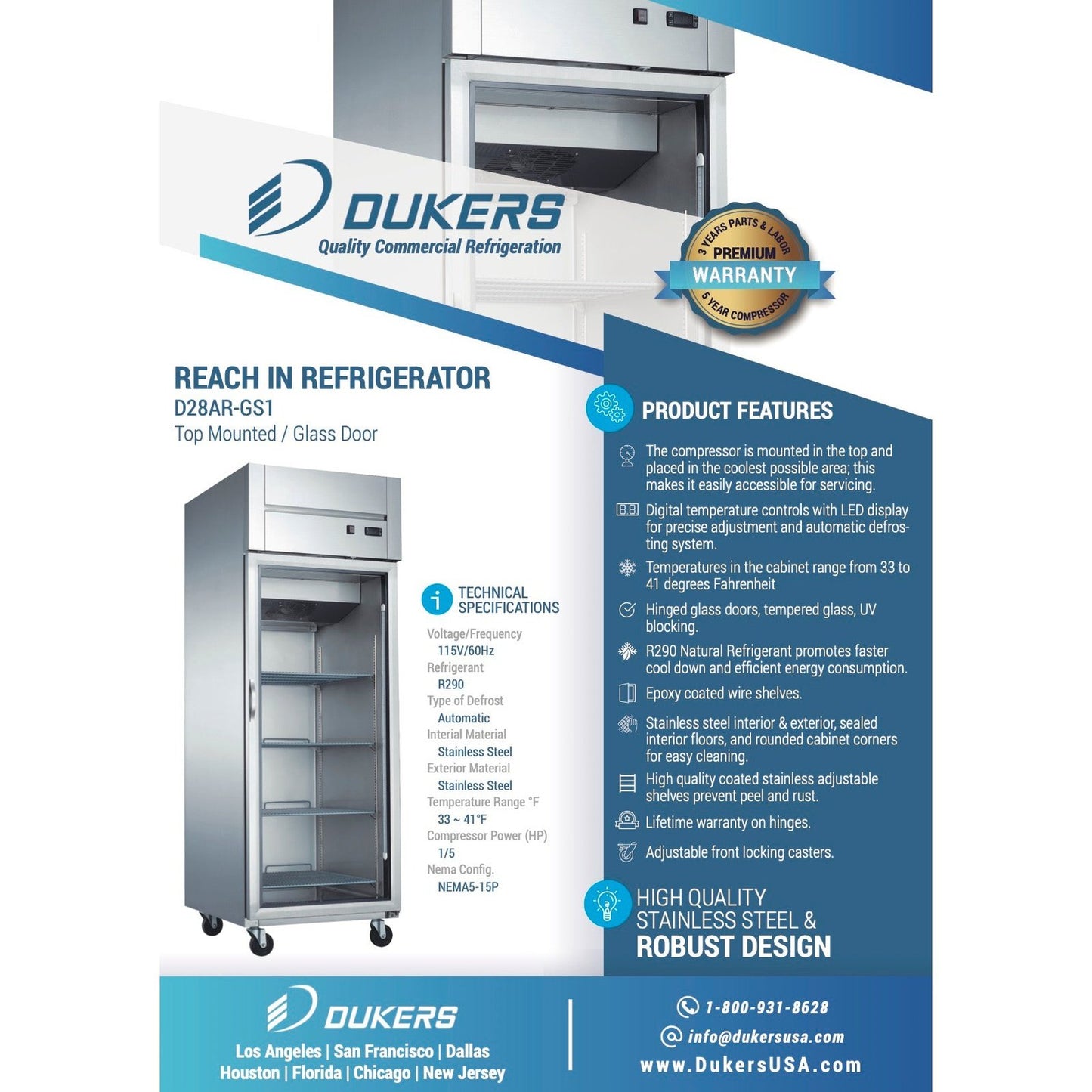 Dukers D28AR-GS1 Top Mount Single Glass Door Commercial Reach-in Refrigerator
