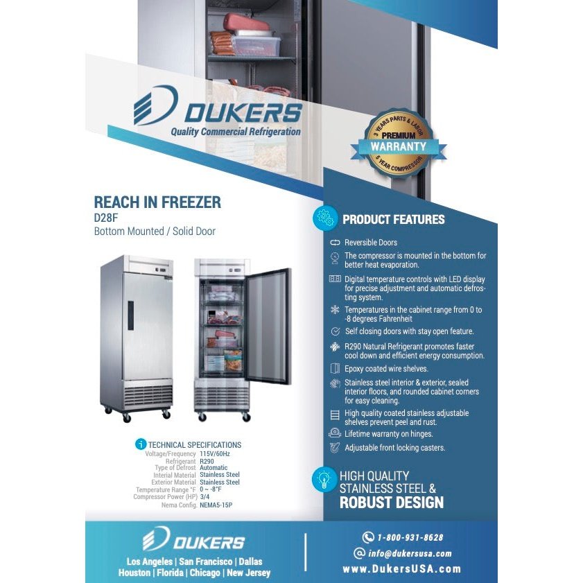 The Dukers D28F reach-in commercial freezer is designed to suit the needs of any business who needs optimal performance without sacrificing design. A single door is accented with high-quality brushed stainless steel for both the interior and exterior to fit a variety of decors. Recessed door handles allow for clean styling and better ergonomics. Door is reversible. The heavy-duty 3/4 HP compressor is bottom mounted for excellent efficiency and better cooling. Digital controls fine-tune the desired interior temperature. Self-closing doors free up your hands for added convenience and ease of use. Auto-defrosting provides lower energy costs and colder temperatures. Four shelves can be adjusted or removed for flexibility and maintenance. Easily move and position with four swivel casters.
