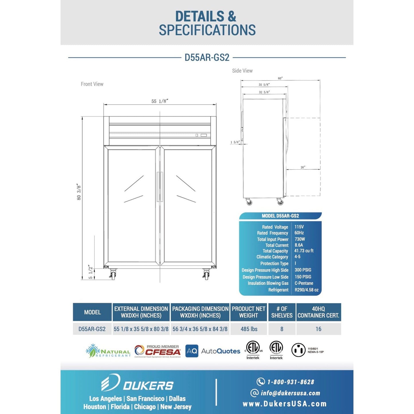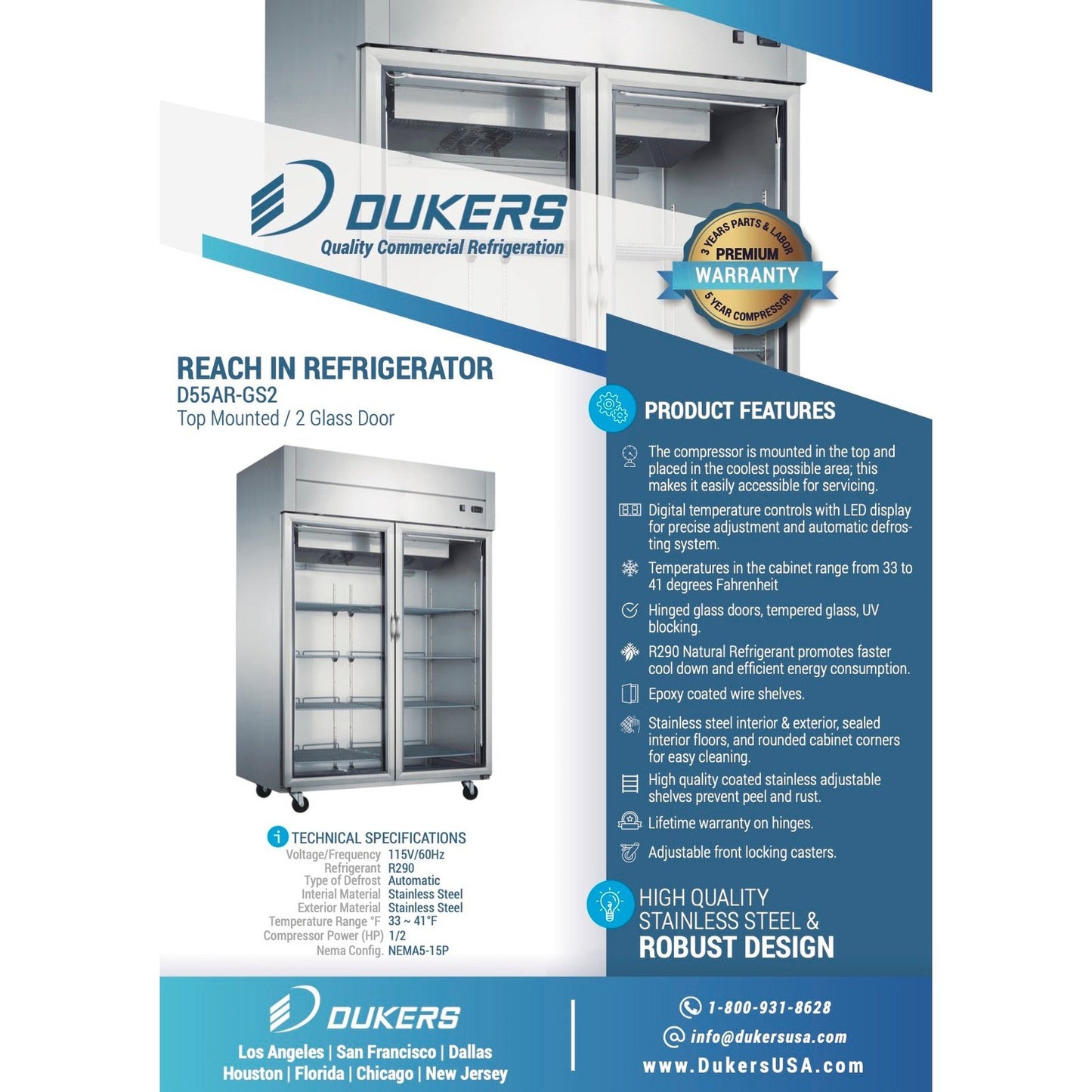 Dukers D55AR-GS2 Top Mount Glass 2-Door Commercial Reach-in Refrigerator