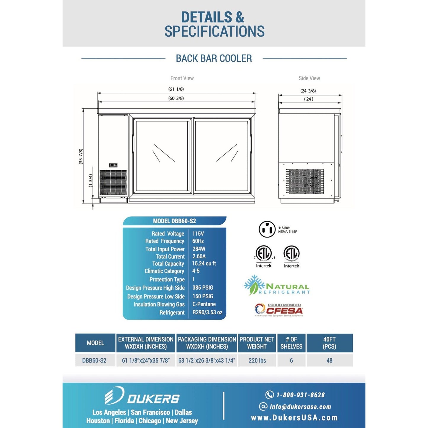 The Dukers DBB60-S2 under bar refrigerator is designed to chill and organize beer, soda, juice, and drink mixers in a convenient space-saving cabinet. Featured in a large 61 in. size and two doors, double pane tempered glass block UV light to safely keep all types of drinks ready to serve. Constructed of commercial-grade body panels in black textured finish to fit all decors and living spaces. Precision digital temperature controls allow pinpoint accuracy with temperatures from 33-38°F. Includes 4 adjustable and removable wire shelves. Uses sliding glass doors.