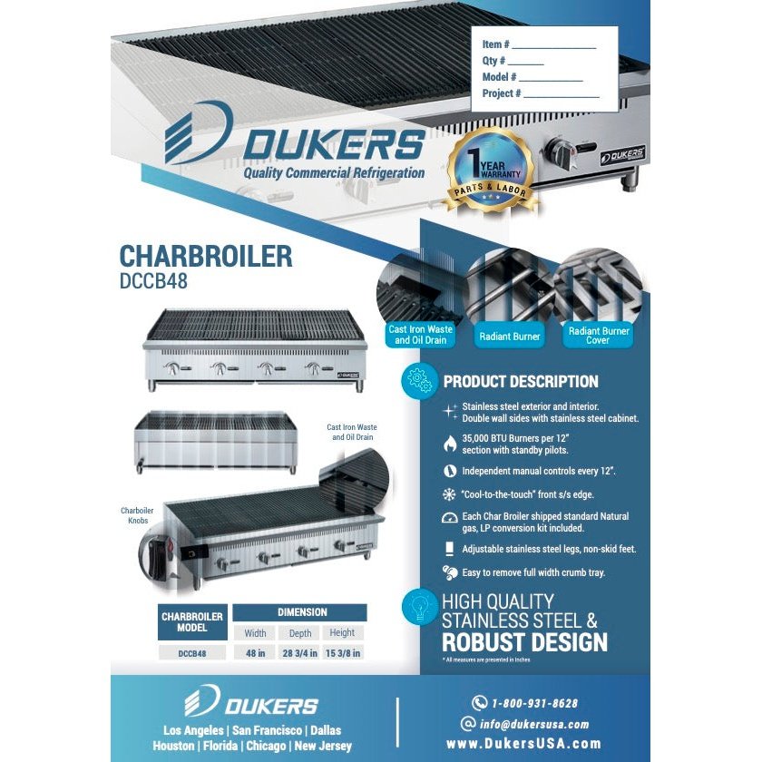 The Dukers DCCB48 48 in. W Countertop Charbroiler features 35,000 BTUs, independent manual controls, a full width crumb tray and adjustable stainless steel legs.