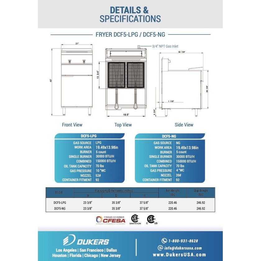 The Dukers DCF5-LPG liquid propane gas fryer has the power to fry a variety of popular appetizers and entrees to perfection.
