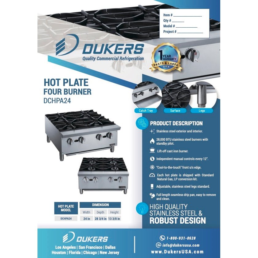 The Dukers DCHPA24 hot plate with 4 burners features 28,000 BTUs and works with natural gas or liquid propane.