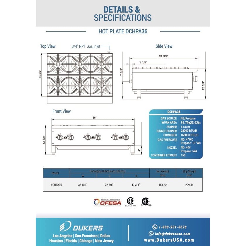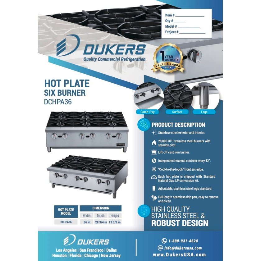 The Dukers DCHPA36 hot plate with 6 burners features 28,000 BTUs and works with natural gas or liquid propane.