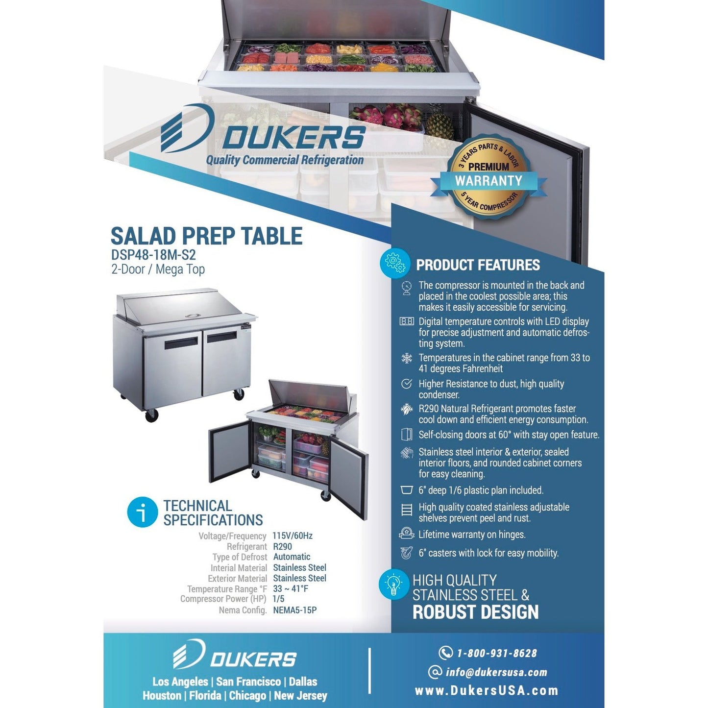 Dukers DSP48-18M-S2 2-Door Commercial Food Prep Table Refrigerator in Stainless Steel with Mega Top