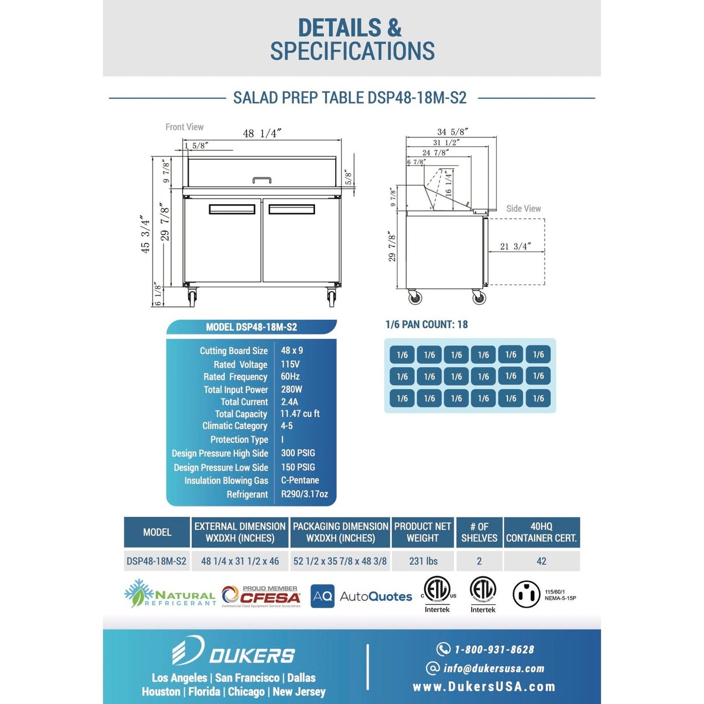 The Dukers DSP48-18M-S2 commercial food prep table refrigerator is constructed of durable brushed stainless steel to handle all the challenges in the kitchen. It’s designed with ample space for food storage and preparation to perform as well as it looks. Constructed of durable brushed stainless steel to handle years of use while being easy to maintain. Includes 18 1/6 pan containers to hold a large assortment of food and toppings. Features recessed handle for clean styling. Digital controls fine-tune the desired interior temperature. Foam insulated for consistent temperatures. Self-closing doors free up your hands for added convenience and ease of use. Auto-defrosting provides lower energy costs and colder temperatures. Includes cutting board to quickly prepare food and 4 in. locking casters for mobility. Mega Top model holds an additional row of containers for extra storage (Total: 18).