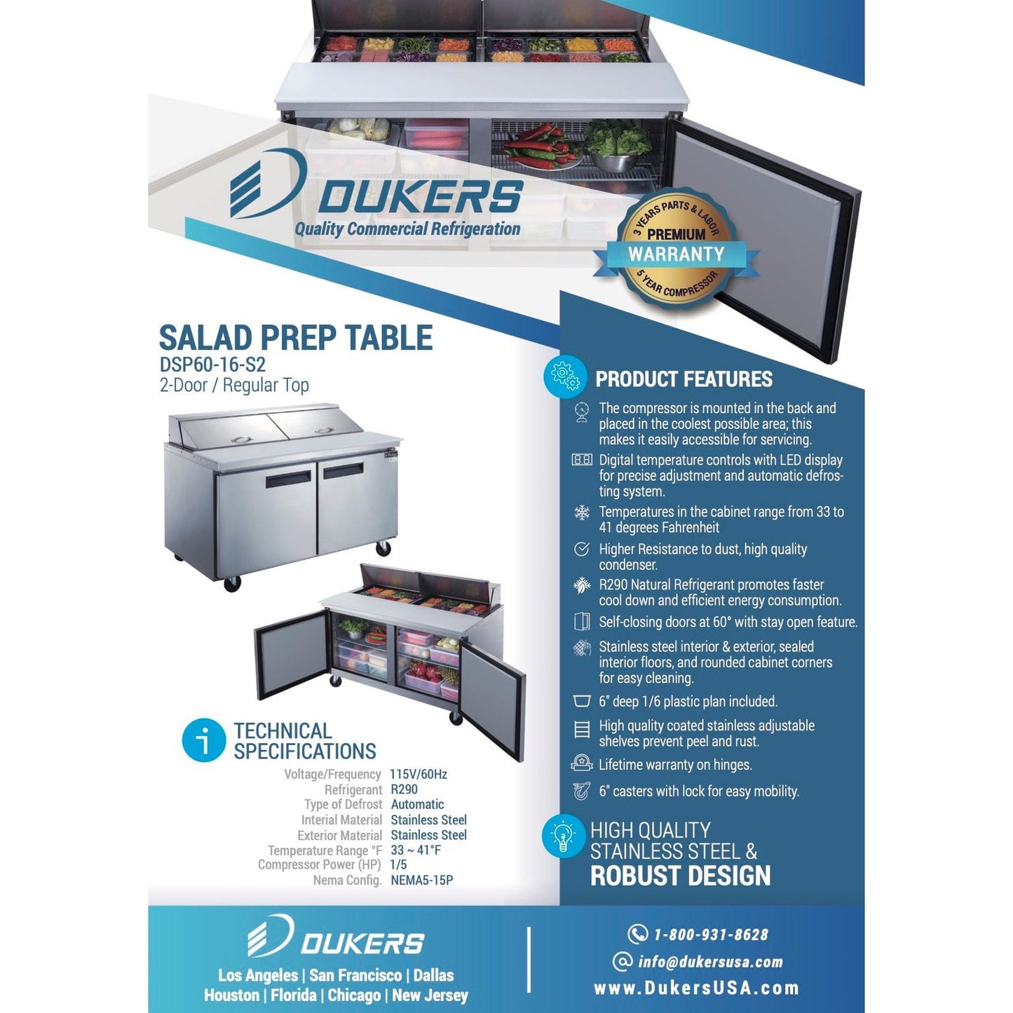 The Dukers DSP60-16-S2 commercial food prep table refrigerator is constructed of durable brushed stainless steel to handle all the challenges in the kitchen. It’s designed with ample space for food storage and preparation to perform as well as it looks. Constructed of durable brushed stainless steel to handle years of use while being easy to maintain. Includes 16 1/6 pan containers to hold a large assortment of food and toppings. Features recessed handles for clean styling. Digital controls fine-tune the desired interior temperature. Foam insulated for consistent temperatures. Self-closing doors free up your hands for added convenience and ease of use. Auto-defrosting provides lower energy costs and colder temperatures. Includes cutting board to quickly prepare food and 4 in. locking casters for mobility.
