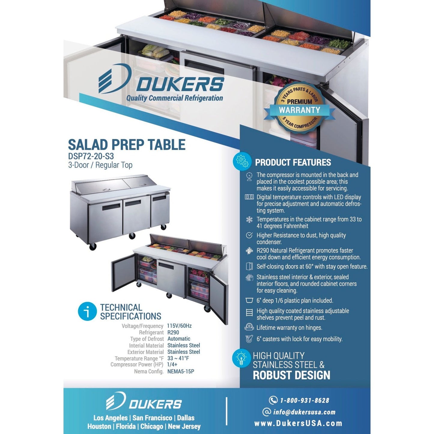 Dukers DSP72-18-S3 3-Door Commercial Food Prep Table Refrigerator in Stainless Steel