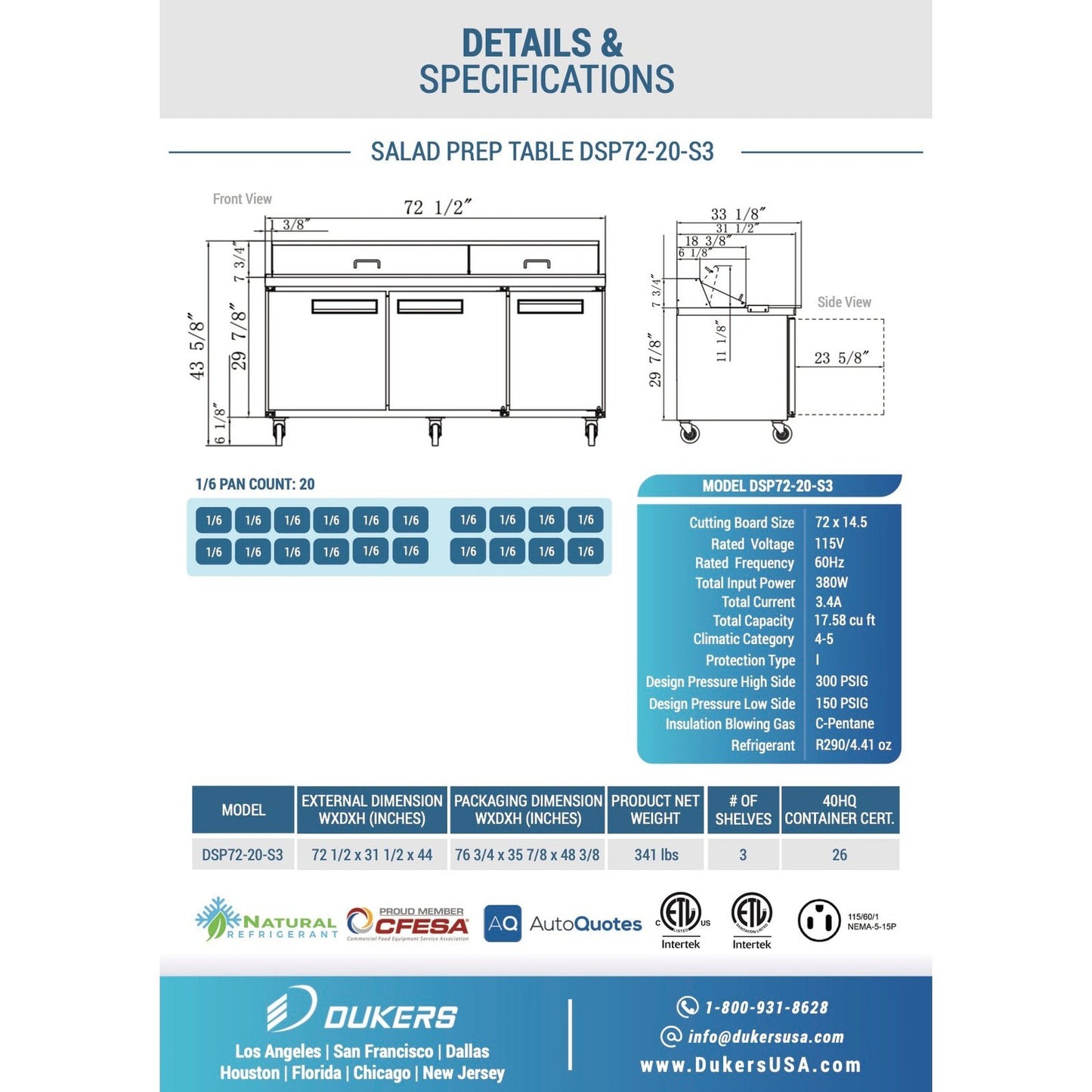 The Dukers DSP72-18-S3 commercial food prep table refrigerator is constructed of durable brushed stainless steel to handle all the challenges in the kitchen. It’s designed with ample space for food storage and preparation to perform as well as it looks. Constructed of durable brushed stainless steel to handle years of use while being easy to maintain. Includes 20 1/6 pan containers to hold a large assortment of food and toppings. Features recessed handles for clean styling. Digital controls fine-tune the desired interior temperature. Foam insulated for consistent temperatures. Self-closing doors free up your hands for added convenience and ease of use. Auto-defrosting provides lower energy costs and colder temperatures. Includes cutting board to quickly prepare food and 6 in. locking casters for mobility.
