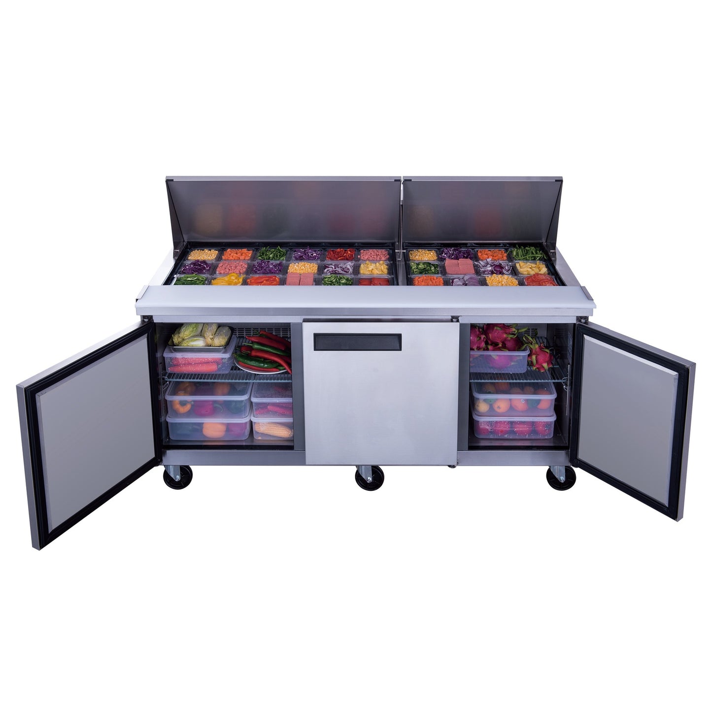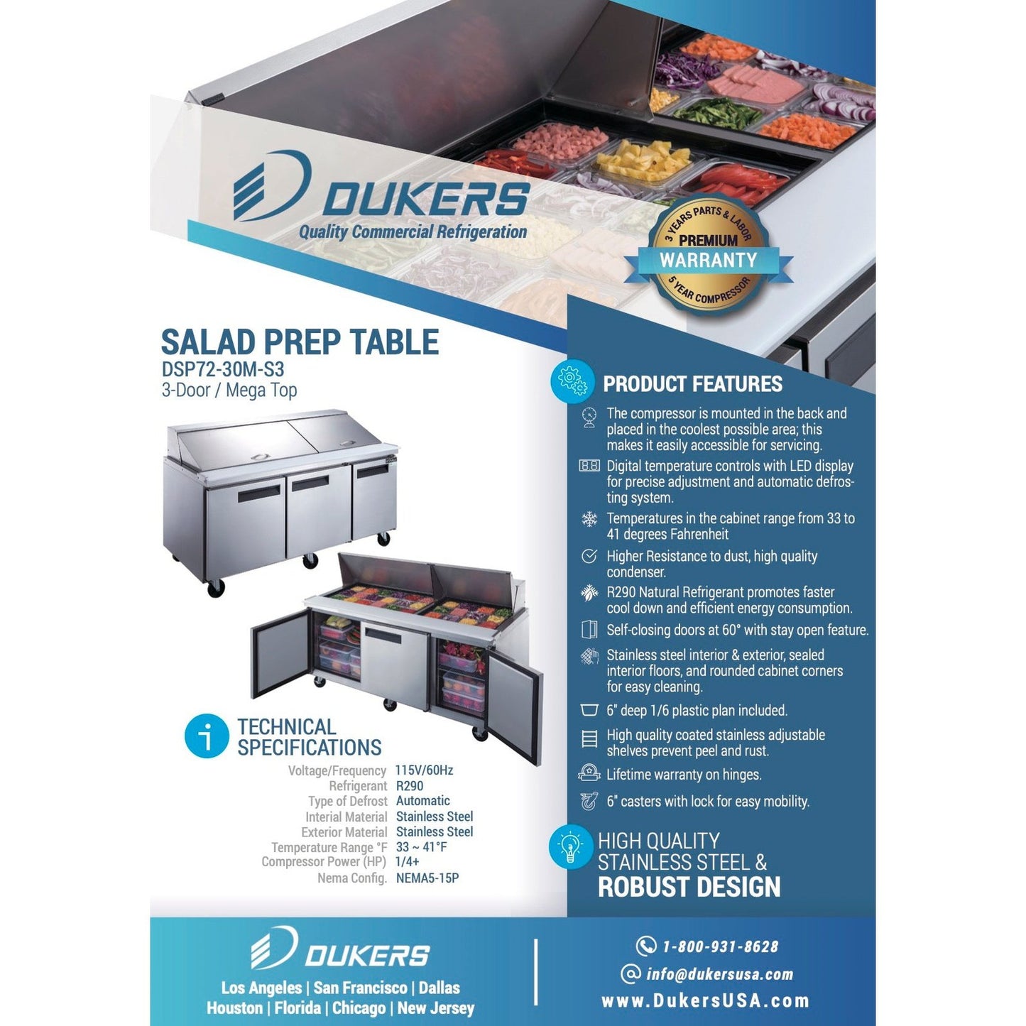 Dukers DSP72-30M-S3 3-Door Commercial Food Prep Table Refrigerator in Stainless Steel with Mega Top