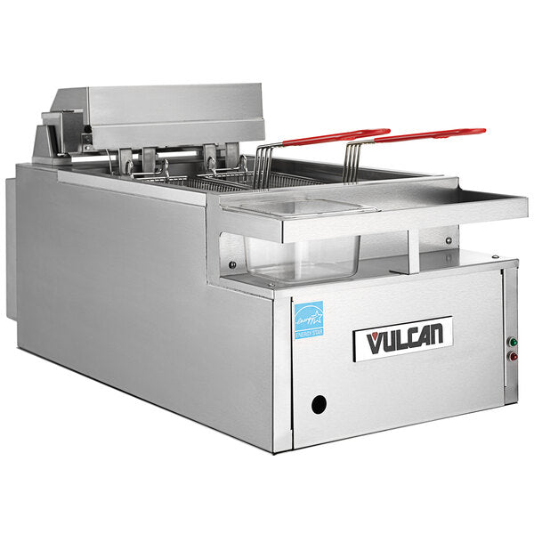 The Vulcan CEF75 countertop fryer comes with twin fry baskets to cook two food types at once. Its basket handles facilitate lifting and transport and are coated in plastic to keep them cool to the touch. For durability, the fryer's tank, front, and sides are made of stainless steel. This unit fits on a countertop; it measures 27 inches wide by 37 inches deep by 203⁄8 inches high.