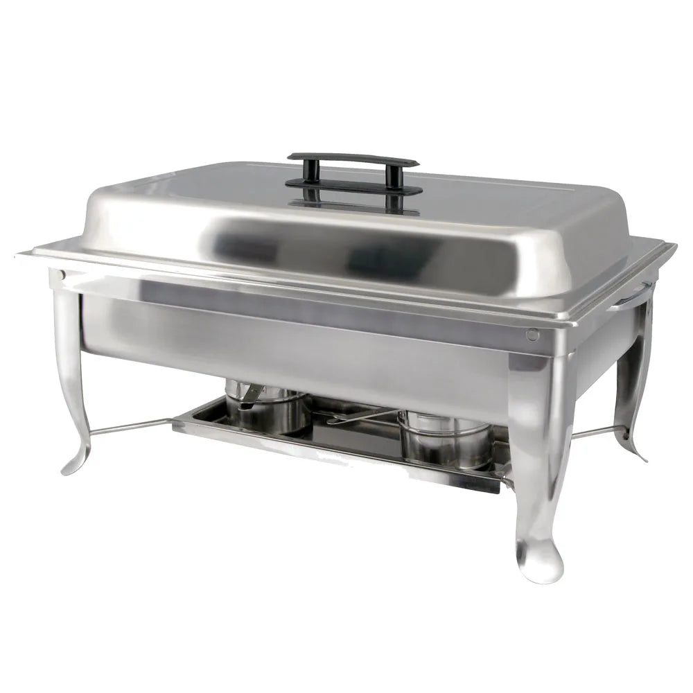 Bellaire Chafer, 8 qt., full size, rectangular, with folding stand, polished cover with lid clips, includes water pan, food pan and (2) fuel holders, stainless steel