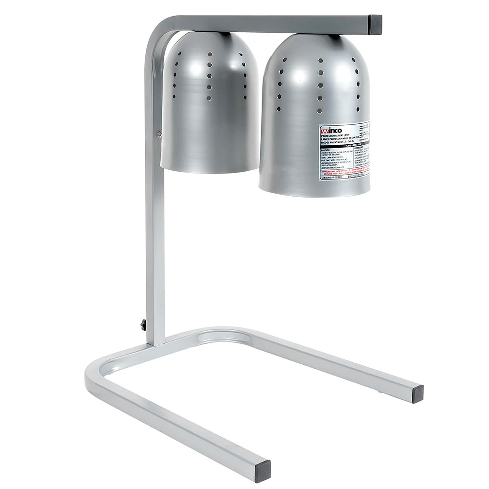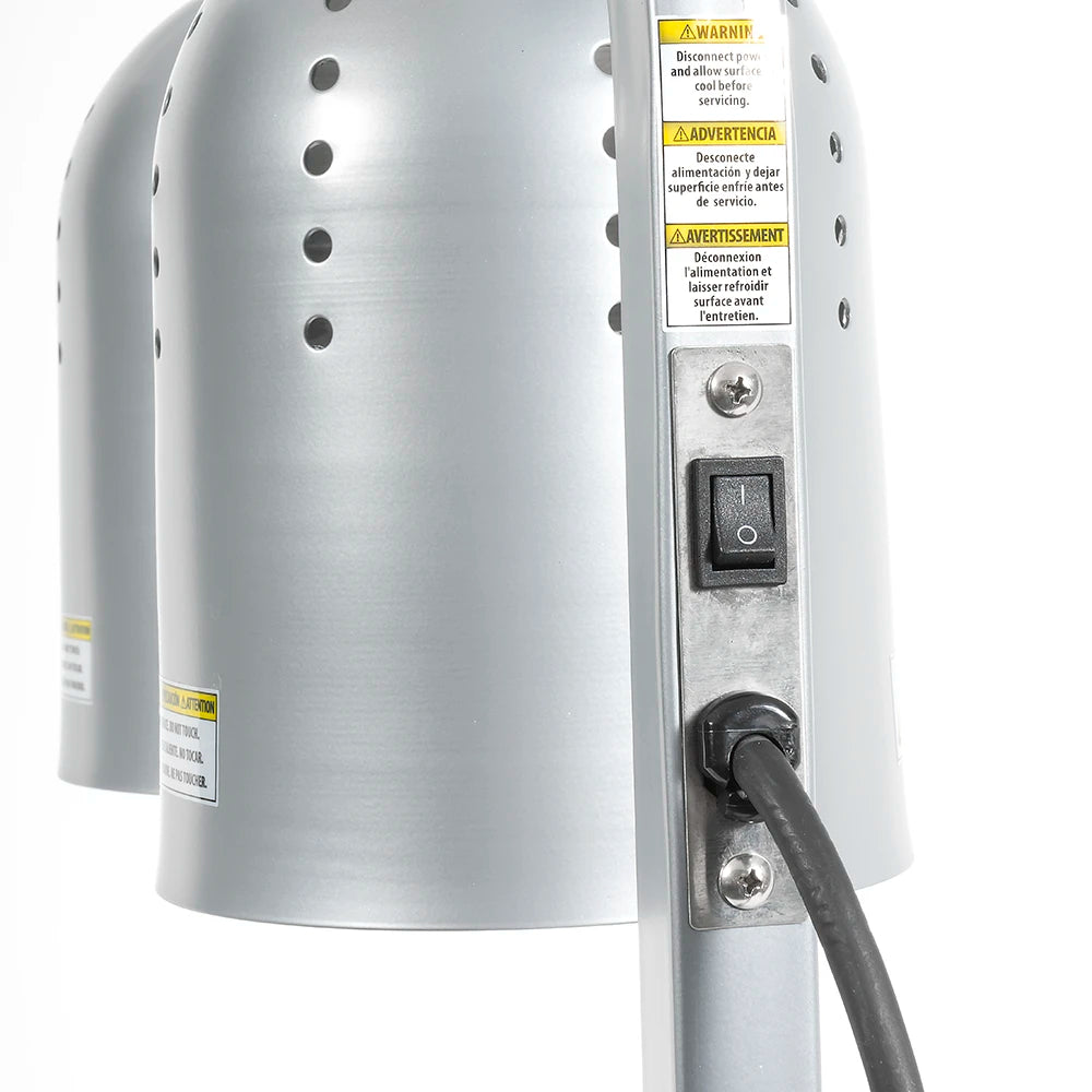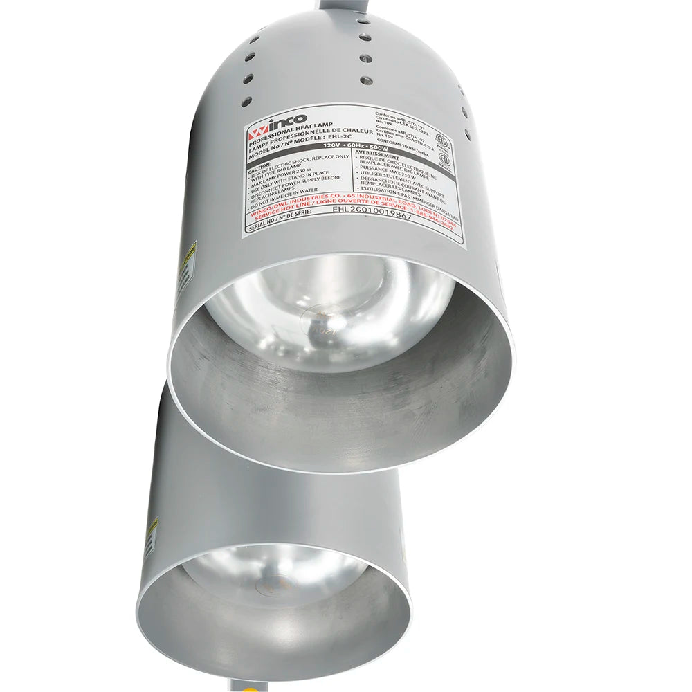 The Winco EHL-2C freestanding electric heat lamp has three heights, so users can choose how intensely food will be heated. Using two shatter-resistant bulbs, the lamp keeps food at an appetizing temperature until ready to serve. Coated with an electrostatic powder, the stainless steel frame and aluminum light hoods are convenient to wipe clean and resist scratches.