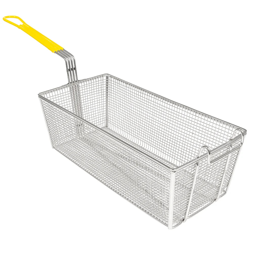 Because the Winco FB-40 fryer basket has a heat-resistant plastic handle coating, the user's comfort and safety during operation is ensured. This handle coating is yellow, which helps it stand out in the kitchen so chefs can quickly find it. For increased durability, the basket is made of only one piece, and its corners are reinforced with heavy-gauge wire.